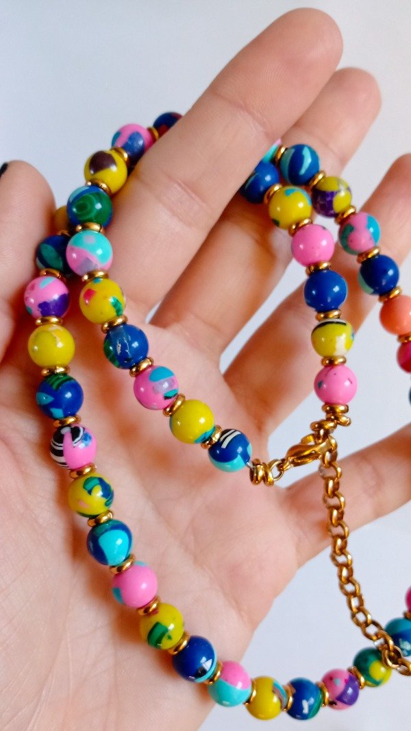 Collarcito hecho a mano con amor, con cuentas de PIEDRA RECONSTITUÍDA en resinas de colores. (De base son resinas en color amarillo, azul y rosa, con pedacitos de piedras POSTA que le da ese no se qué como popurrí piedrístico colorido)