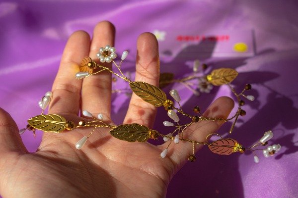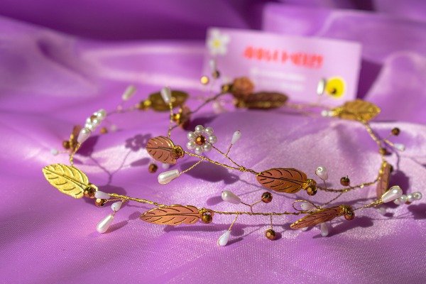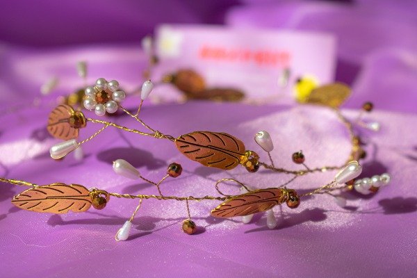 MATERIALES: Margaritas con centro de cristal dorado facetado (que le da brillo), perlitas de vidrio y hojitas metálicas enlazadas con alambre de cobre con baño dorado.